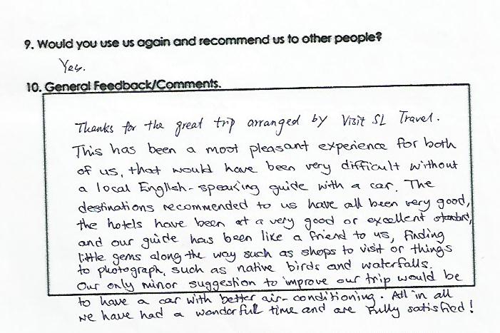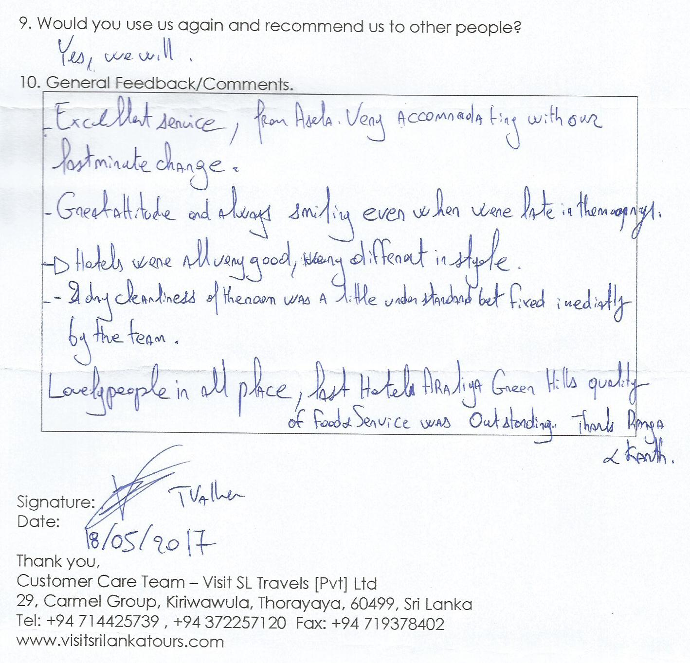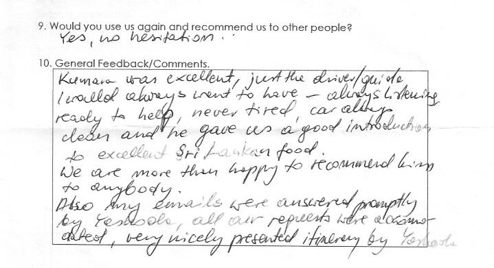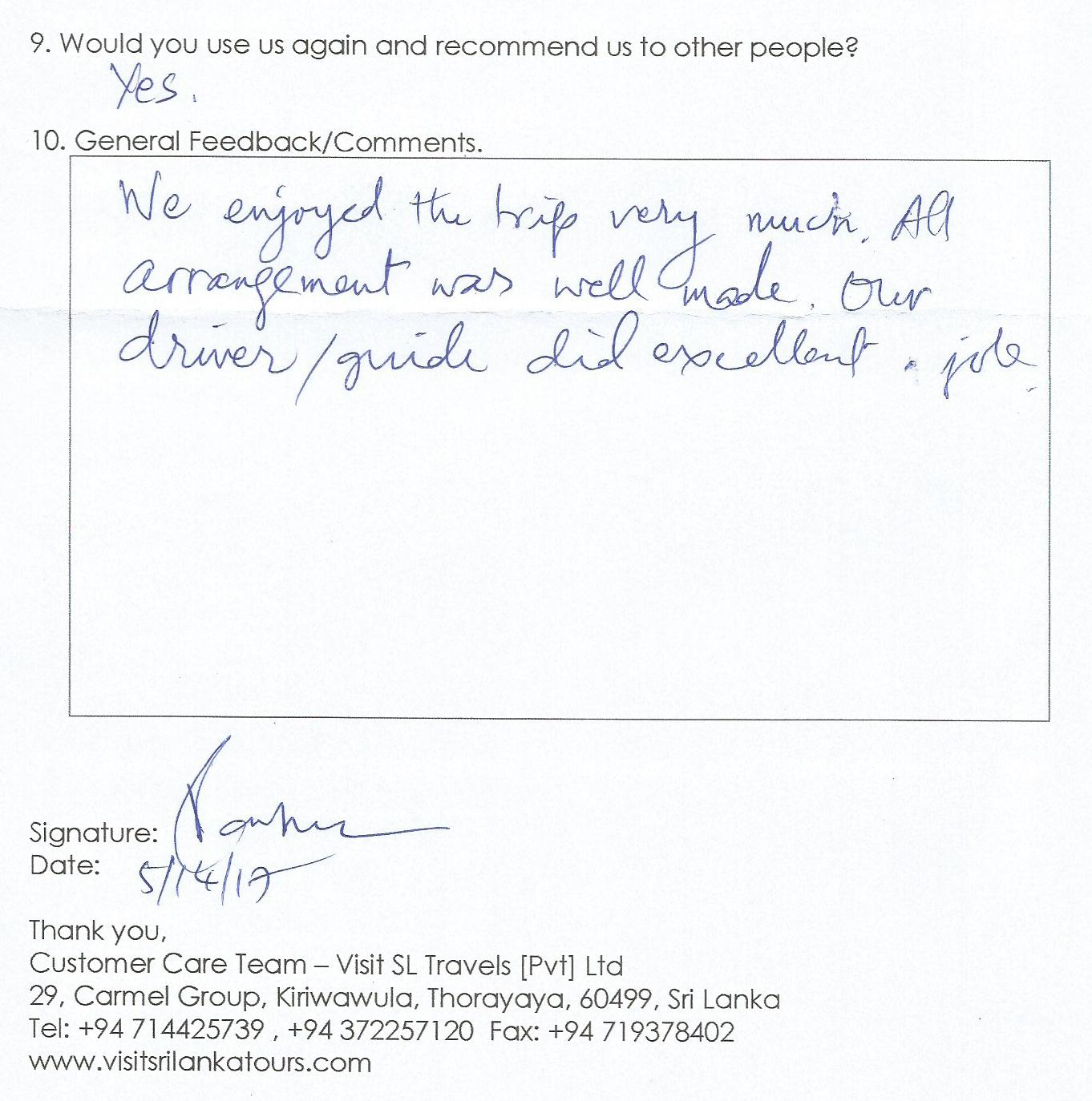 Greetings. A very quick note to thank you for all the arrangements. Your team, and Sampath in particular, did a fantastic job. I would have no hesitation in recommending your company to anybody visiting Sri Lanka and am very prepared to offer a reference. Hope to meet up the next time we visit. 04/01/2017