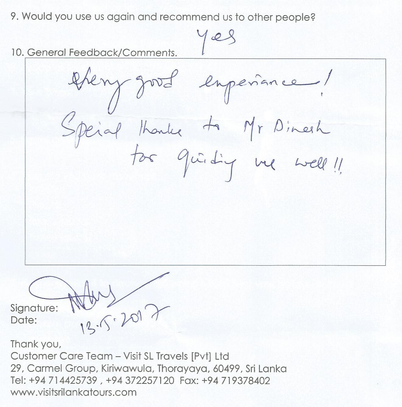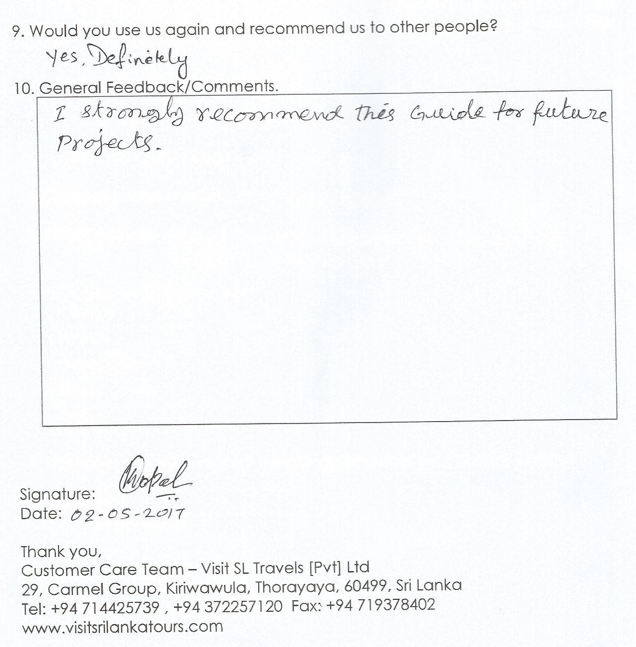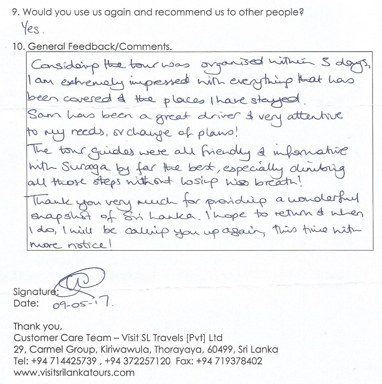 Greetings. A very quick note to thank you for all the arrangements. Your team, and Sampath in particular, did a fantastic job. I would have no hesitation in recommending your company to anybody visiting Sri Lanka and am very prepared to offer a reference. Hope to meet up the next time we visit. 04/01/2017