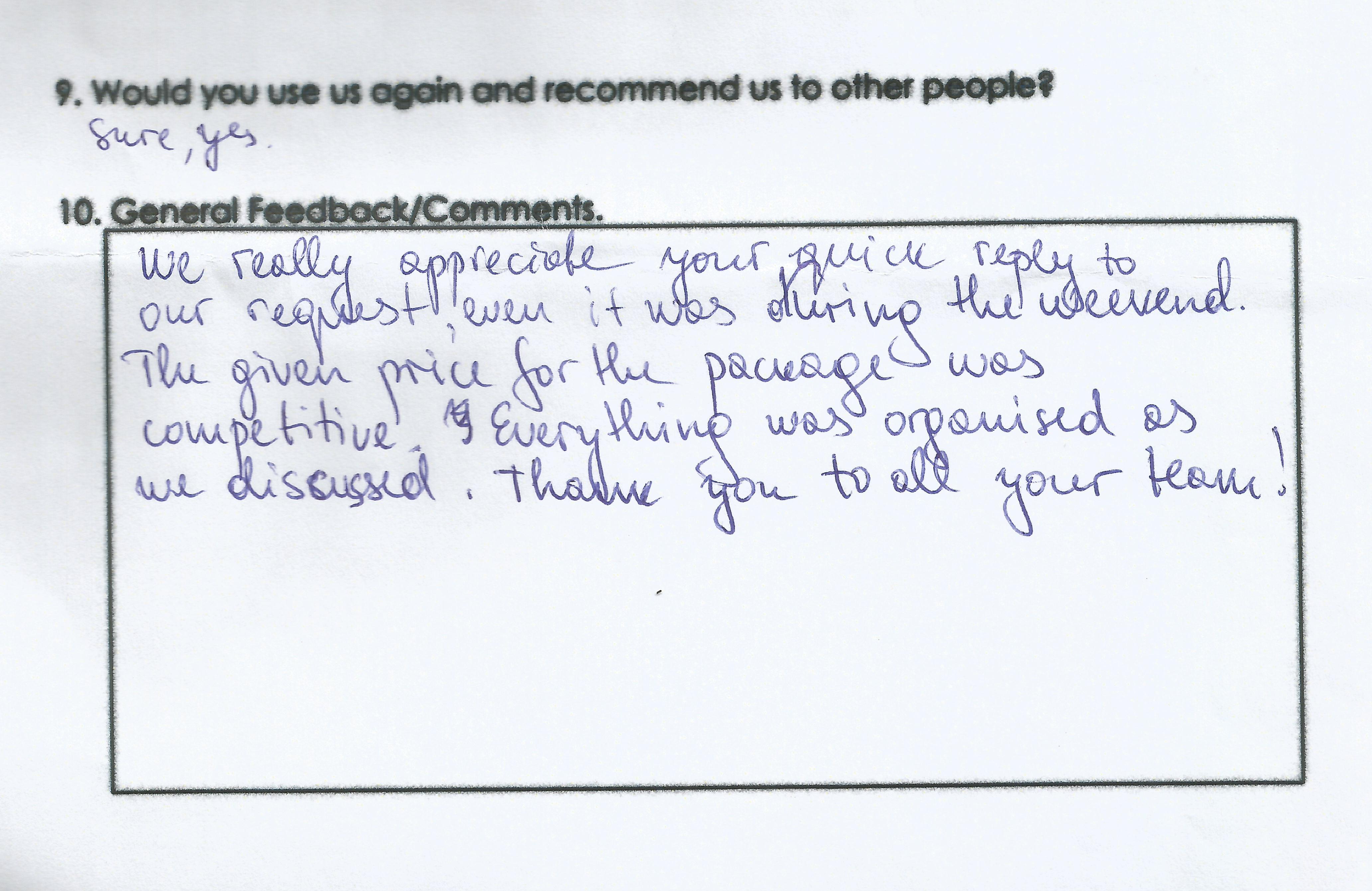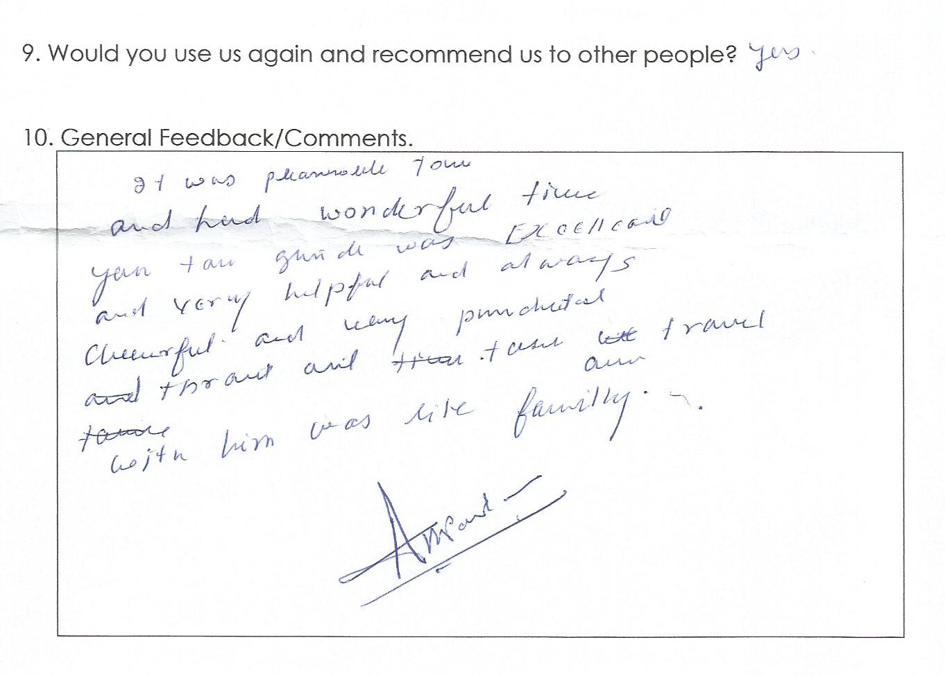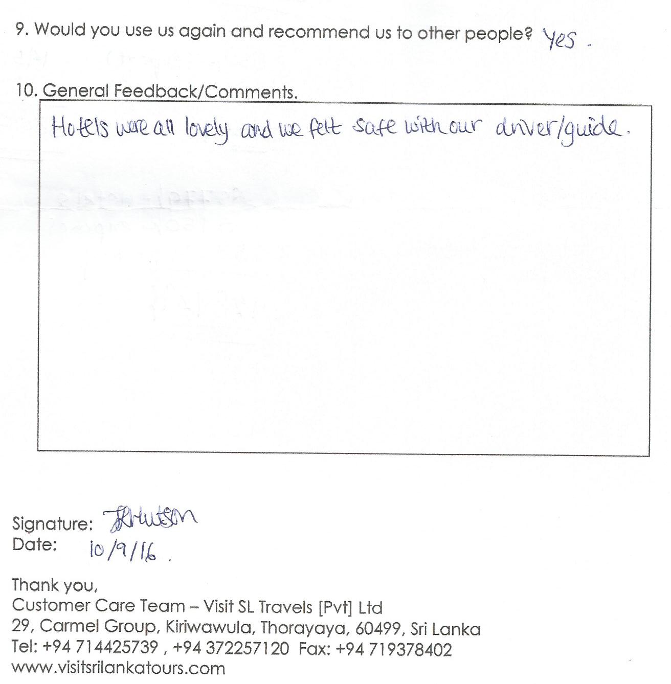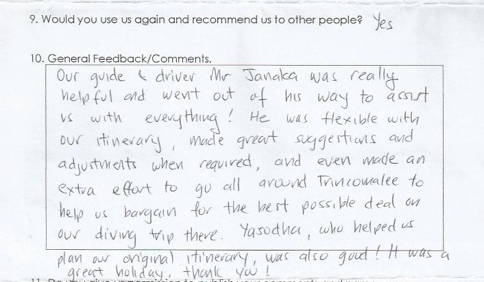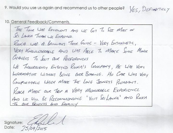 Greetings. A very quick note to thank you for all the arrangements. Your team, and Sampath in particular, did a fantastic job. I would have no hesitation in recommending your company to anybody visiting Sri Lanka and am very prepared to offer a reference. Hope to meet up the next time we visit. 04/01/2017