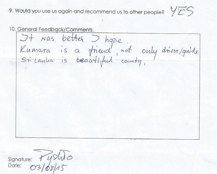 We are satisfied for all the places visited, this tour had given us a good overall view of Sri Lanka and we plan to come back. 07/02/2017