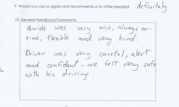 The guide has been fantastic for our whole trip, always on time and giving us other ideas what to do along the way. The hotels were all very nice and so were the trips. Thank you. 09/04/2015